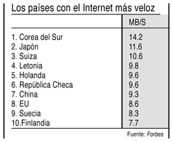 Parece ser que hay una relación entre progreso y velocidad de Internet. Me explico: los países en los que las redes son más rápidas son aquellos en los que el desarrollo económico es mayor. Mientras que en México los proveedores escasamente ofrecen 5 megabites por segundo como promedio, y a precio alto, en países como Corea del Sur, Japón y Suiza es mayor a 10 Mb/s.