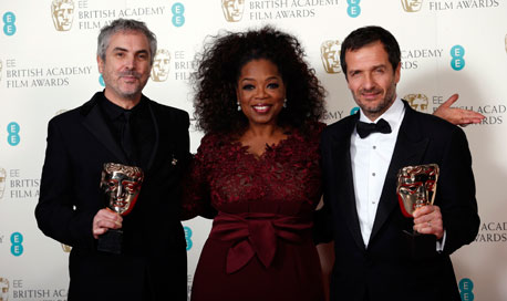La cinta del mexicano se llevó seis galardones de la Academia Británica de las Artes Cinematográficas y la Televisión: filme británico destacado, director, sonido, música original, efectos visuales y fotografía, del también mexicano Emmanuel Lubezki. Ambos creadores son los primeros connacionales en recibir el codiciado premio; 12 años esclavo, de Steve McQueen, ganó como mejor película. En la imagen, la conductora Oprah Winfrey y el productor de Gravedad, David Heyman, acompañan a Cuarón Foto Reuters