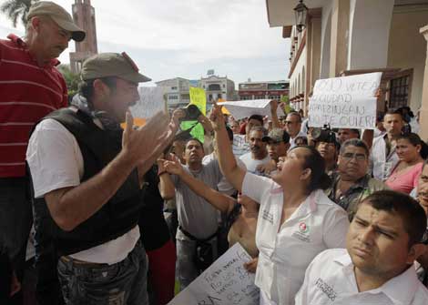 Simpatizantes del presidente municipal de Apatzingán, Uriel Chávez, se enfrentaron a gritos con integrantes del consejo ciudadano (izquierda) durante el discurso del alcalde, previo a su salida del ayuntamiento Foto Víctor Camacho