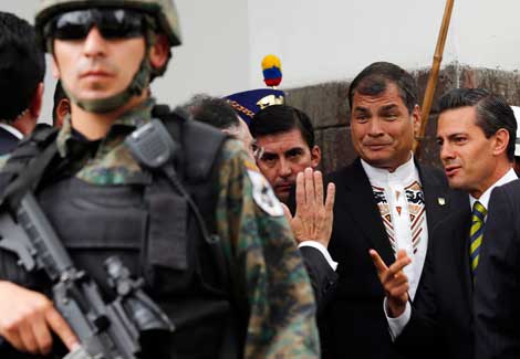Los presidentes de Ecuador, Rafael Correa (segundo de derecha a izquierda), y de México, Enrique Peña Nieto, conversan con un hombre no identificado al salir de su encuentro en el palacio Carondelet, en Quito. Los mandatarios acordaron incrementar la cooperación de los dos países en seguridad Foto Ap