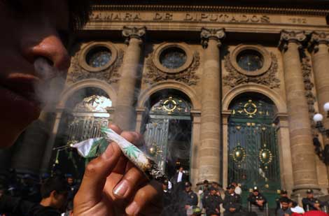 Consumidores de mariguana se manifestaron frente al recinto legislativo, en el cruce de Donceles y Allende, para exigir que sus planteamientos sean tomados en cuenta en los foros de discusión que se realicen sobre la iniciativa presentada por diputados del PRD, sobre la despenalización de la droga. Señalaron que volverán a protestar el domingo 30 de marzo y el 8 de abril Foto Francisco Olvera