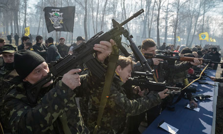 En la reunión que sostuvieron en Londres el secretario de Estado estadunidense, John Kerry, y el canciller ruso, Sergei Lavrov, para analizar el conflicto en Ucrania, no lograron zanjar diferencias. Kerry advirtió que no se reconocerá el resultado del referendo en Crimea, mientras Lavrov indicó que si hay sanciones, éstas afectarán la relación de Rusia con Occidente. En la imagen, 500 voluntarios realizan prácticas de tiro en una base cercana a Kiev Foto Reuters