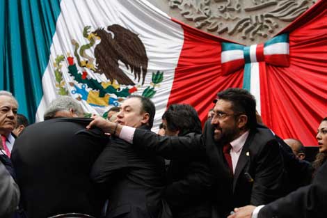 La Ley de Pensión Universal y la del Seguro de Desempleo causaron crispación entre legisladores priístas y un sector de perredistas, petistas y del Movimiento Ciudadano, quienes rechazaban que el pago a trabajadores en cesantía se fondeara con la subcuenta de vivienda. El diputado del Partido del Trabajo Manuel Huerta, quien desplegó dos mantas contra el presidente Enrique Peña Nieto, fue jaloneado por representantes del tricolor Foto Cuartoscuro