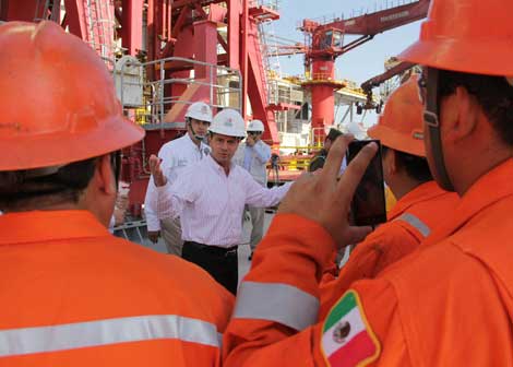 En la conmemoración del 76 aniversario de la expropiación petrolera realizada en Cosoleacaque, Veracruz, el presidente Enrique Peña Nieto recorrió la plataforma semisumergible de perforación de aguas profundas Centenario GR Foto Presidencia
