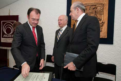 Luis Videgaray, secretario de Hacienda y Crédito Público; José Narro Robles, rector de la UNAM, y Enrique Fernández Fassnacht, secretario ejecutivo de la Asociación Nacional del Universidades e Instituciones de Educación Superior (Anuies), durante la ceremonia en la que el funcionario federal recibió un reconocimiento por su labor en favor del incremento presupuestal para las casas de estudio en 2014 Foto Cristina Rodríguez