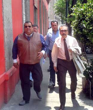Cuauhtémoc Gutiérrez de la Torre (con chaleco de piel), el hasta ayer dirigente del PRI en el Distrito Federal, arriba a sus oficinas. El político se negó a hacer comentarios sobre la revelación de que opera una red de prostitución para su servicio Foto Bertha Teresa Ramírez