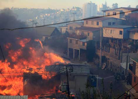 Alrededor de mil 250 bomberos, con apoyo de 17 aeronaves y unos 2 mil carabineros y policías, intentan evitar que el fuego se propague a más viviendas en el puerto chileno de Valparaíso. En la tarde de ayer, los incendios forestales se extendieron con rapidez hacia sectores poblados y sorprendieron a miles de personas que viven en la periferia de la localidad Foto Reuters