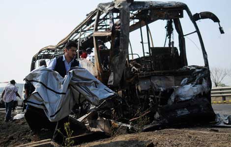 El autobús de la empresa Turtles Tour, arrendado por la compañía de viajes Huicho, con sede en Villahermosa, Tabasco, quedó totalmente calcinado tras chocar con un tractocamión de la firma Prolat, que se ubica en Tepatitlán, Jalisco, estacionado sin señalamientos en la autopista Cosamaloapan-Acayucan. En la unidad turística viajaban unos 40 pasajeros Foto Reuters