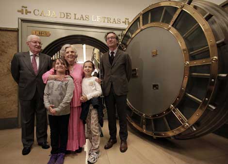 Elena Poniatowska depositó ayer su legado en la Caja de las Letras del Instituto Cervantes. La colaboradora de La Jornada fue acompañada por sus nietas Inés y Luna; por Víctor García de la Concha, director de la institución (izquierda), y por José María Lasalle, secretario de Cultura de España Foto Notimex