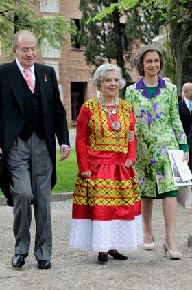 Los reyes de España, Juan Carlos de Borbón y Sofía, quien lleva en la mano una impresión de La Jornada, caminan junto a Elena Poniatowska, ataviada con un huipil juchiteco, hacia el paraninfo de la Universidad de Alcalá de Henares, donde la escritora recibió el Premio Cervantes de Literatura Foto Notimex