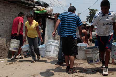 Ante la falta de agua potable por la suspensión del servicio desde el pasado jueves, la llegada de una pipa causó revuelo en un predio del pueblo de Santiago Ahuizotla, donde todo fue ir y venir para almacenar el líquido en botes Foto José Antonio López