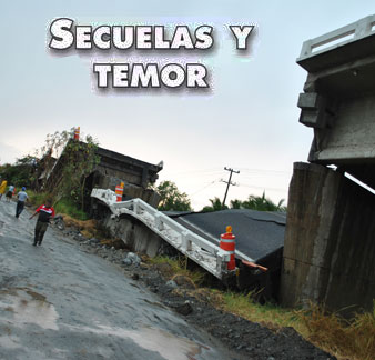 un puente; casas dañadas en la Costa Grande