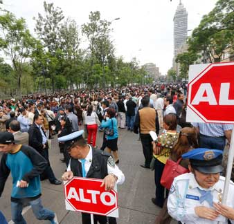 Dos placas del puente vehicular ubicado en El Cuajilote, Guerrero, en la vía Acapulco-Zihuatanejo, se vinieron abajo por efectos del sismo de ayer. En la ciudad de México muchos edificios fueron evacuados. La imagen, en avenida Juárez, a la altura de la Alameda Fotos La Jornada Guerrero y Carlos Ramos Mamahua