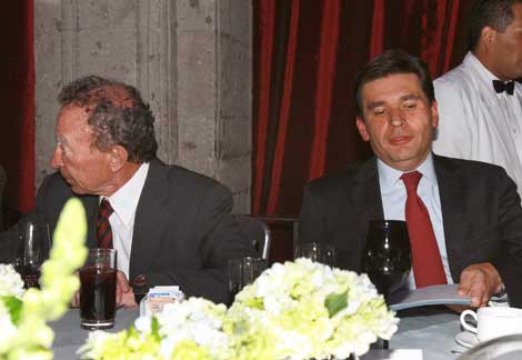 Guillermo Ortiz Martínez, presidente del consejo de administración del Grupo Financiero Banorte, y Fernando Aportela, subsecretario de Hacienda, en el encuentro organizado por la corporación crediticia. Este último arguyó que el titular de la SHCP, Luis Videgaray, canceló a última hora su participación por estar en una reunión con el presidente Enrique Peña Nieto Foto Roberto García Ortiz