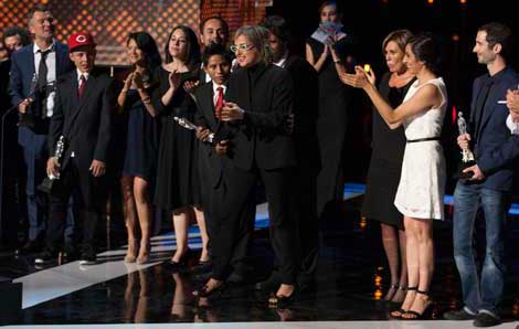 La cinta dirigida por Diego Quemada-Diez y producida por Inna Payán (al centro) se llevó nueve de las 14 estatuillas en las que estuvo seleccionada, entre ellas mejor película, ópera prima, actor, edición, fotografía y guión original. El fi lme trata sobre el peligroso viaje que emprenden los migrantes por México hacia Estados Unidos. Amat Escalante sólo le arrebató el galardón de mejor dirección por Heli. La veterana Adriana Roel se llevó el Ariel a mejor actriz por su papel en No quiero dormir sola. En la imagen, los participantes en la película triunfadora Foto Cristina Rodríguez