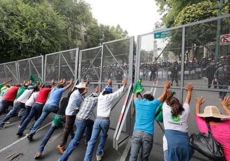 Integrantes de organizaciones agrupadas en el Frente Auténtico Campesino derribaron algunas de las vallas colocadas en calles aledañas a la Secretaría de Gobernación, para exigir