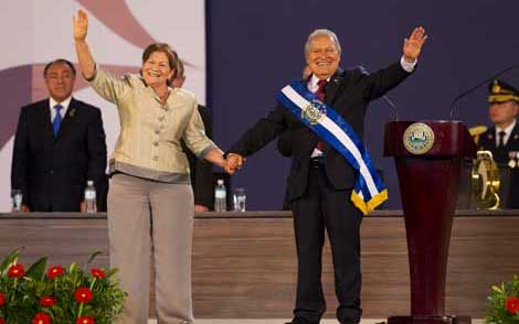 Salvador Sánchez Cerén prestó juramento para conducir el país centroamericano durante 5 años con el compromiso de mantener el diálogo con todos los sectores, hacer crecer la economía y enfrentar la inseguridad. Maestro de 69 años, es el primer gobernante surgido del Frente Farabundo Martí para la Liberación Nacional, que combatió entre 1980 y 1992 al ejército y la ultraderecha, apoyada por Estados Unidos. Su antecesor, Mauricio Funes, también fue abanderado del FMLN, pero no pertenecía al partido. Lo acompaña su esposa Margarita Villalta Foto Ap