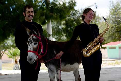 El grupo artístico ha recorrido decenas de polvosas rancherías y comunidades rurales. La compañía la integran Kasia Sek, Jaime Hevia, tres caballos, un burro y una carreta. Entre su menaje están 50 marionetas, el vestuario de personajes fantásticos y un saxofón. Narran a La Jornada que no cobran cuotas fijas por su presentación. A cambio reciben unas monedas y la invitación para comer un plato de frijoles y una buena salsa Foto Alfredo Valadez