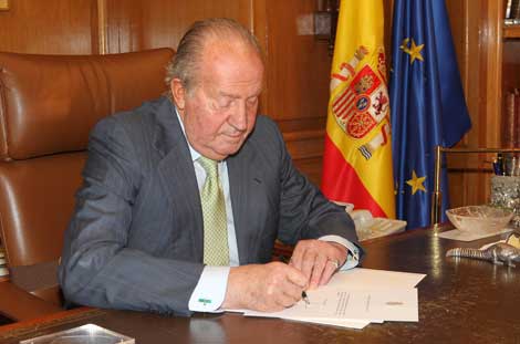 El rey Juan Carlos I de España en el momento de estampar su firma de abdicación al trono y ceder el cargo a su hijo, el príncipe Felipe. Con ese acto busca garantizar la continuidad de la monarquía y de la familia Borbón Foto Xinhua