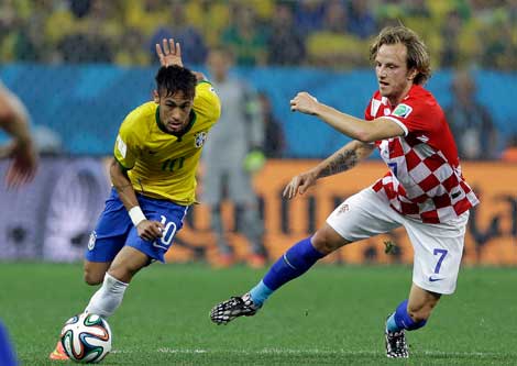 Neymar elude al croata Ivan Rakitic durante el partido inaugural del Mundial en el estadio Arena Corinthians, de Sao Paulo. Fue un encuentro trabado y parejo hasta que el árbitro marcó a los 71 minutos un polémico penal a favor de Brasil, que inclinó la balanza hacia el cuadro verdeamarelo Foto Ap