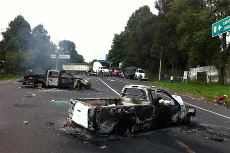 Un grupo de habitantes del municipio michoacano incendió los automotores y bloqueó la carretera a Paracho al exigir apoyo del Programa de Empleo Temporal. Demandaron una reunión con el comisionado Alfredo Castillo porque, afirmaron, desde hace dos años les prometieron ayuda y