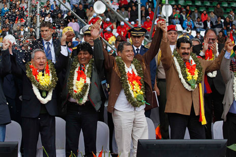 Los presidentes Raúl Castro (Cuba), Evo Morales (Bolivia), Rafael Correa (Ecuador) y Nicolás Maduro (Venezuela) en la ceremonia de bienvenida a las delegaciones asistentes a la cumbre del Grupo de los 77 más China, en el estadio Ramón Tahuichi Aguilera, en Santa Cruz de la Sierra, Bolivia. Entre otros asuntos, se anunció el respaldo técnico de Teherán a La Paz Foto Reuters