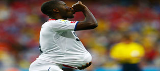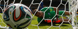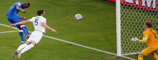 Arriba, el portero griego, Orestis Karnezis. Al centro, el tico Joel Campbell festeja su gol. Sobre estas líneas, el italiano Mario Balotelli (izquierda) anota Fotos Xinhua y Reuters