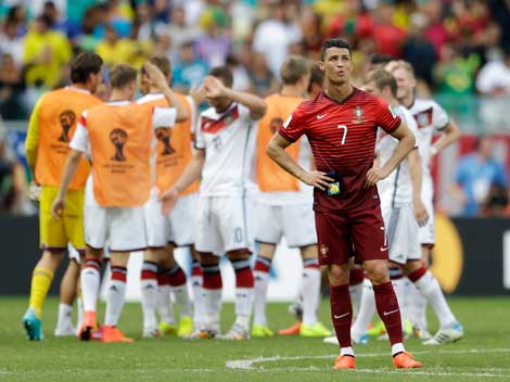 La desesperanza invade al astro portugués Cristiano Ronaldo tras una de las cuatro anotaciones del cuadro alemán, que confirmó su etiqueta de favorito para llevarse la Copa Brasil 2014 Foto Ap