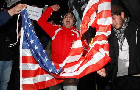 Agrupaciones sociales y políticas realizaron ayer una marcha y plantón frente a la embajada de Estados Unidos en Buenos Aires, en defensa de la soberanía de Argentina. Repudiaron la decisión de la Suprema Corte de Justicia estadunidense que rechazó una apelación del gobierno de Cristina Fernández y ratificó el fallo de un tribunal que ordena pagar al contado mil 300 millones de dólares a tenedores de los llamados fondos buitres o especulativos Foto Reuters