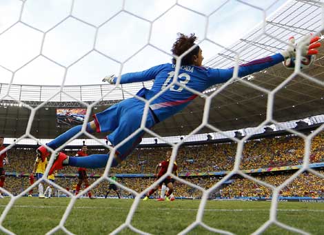 Momento en que Guillermo Ochoa ataja con una mano, y con un espectacular salto, un cabezazo del astro brasileño Neymar que se dirigía a un extremo de la portería en el minuto 25. Con el empleo de la tecnología de