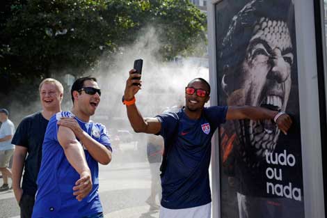 Aficionados estadunidense bromean con una imagen del uruguayo Luis Suárez en la playa de Copacabana, en Río de Janeiro. La sanción al delantero por morder al italiano Giorgio Chiellini lo marginará de buena parte de la Copa América de 2015 y de las nueve primeras fechas de la próxima temporada de la Liga Premier inglesa con su club, Liverpool. El jugador viajó ayer a Montevideo y permanecerá allí hasta que se aclare el panorama Foto Ap