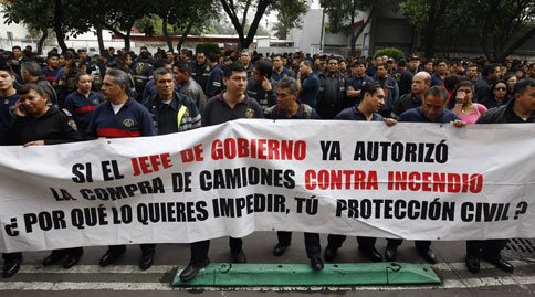 Integrantes del Heroico Cuerpo de Bomberos capitalino aseveraron que la falta de camiones, bombas, cisternas e infraestructura general los expone a riesgos mayores. Aseguraron que existen recursos autorizados para equiparlos, pero no han llegado a ellos. Los inconformes salieron de la estación central, ubicada en Fray Servando Teresa de Mier, y marcharon hasta la Junta Local de Conciliación y Arbitraje, en Doctor Río de la Loza. Después se dirigieron al Zócalo Foto Víctor Camacho