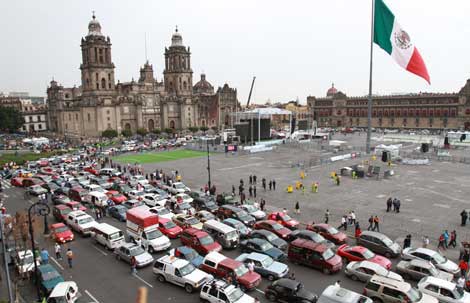 Cientos de automovilistas se congregaron en el Zócalo en repudio a las nuevas disposiciones que entrarán en vigor el primero de julio. Los inconformes llegaron desde diversos puntos, incluidos del estado de México, mediante la convocatoria por redes sociales. Los conductores hicieron sonar los cláxones de sus unidades, la mayoría de modelos de más de 10 años de antigüedad. Muchos expresaron que sus unidades son herramientas de trabajo. Una comisión fue recibida por autoridades del gobierno capitalino Foto Roberto García Ortiz