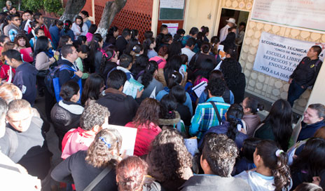 Ante protestas magisteriales, la dependencia suspendió en Michoacán y Oaxaca la primera aplicación del concurso de ingreso al Servicio Profesional Docente, por lo que no participaron 3 mil 655 aspirantes inscritos. Al examen acudieron 128 mil 475 candidatos en 30 entidades. En la imagen, docentes se presentan a la prueba en una secundaria ubicada en la ciudad de México Foto Pablo Ramos