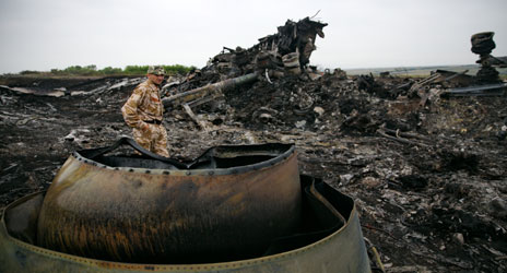 El presidente estadunidense, Barack Obama, señaló que el misil que derribó el Boeing 777 fue lanzado desde territorio controlado por los separatistas ucranios apoyados por Rusia y consideró que la muerte de las 298 personas que iban a bordo es un ultraje de proporciones incalificables. A su vez, el gobierno mexicano lamentó el incidente y se adhirió a un llamado de la ONU para que se efectúe una pesquisa internacional exhaustiva e independiente. En tanto, el ex mandatario cubano Fidel Castro aseguró que la aeronave recibió un impacto cuando volaba por la ruta bajo control del gobierno belicista de Petro Poroshenko. En la imagen, un funcionario inspecciona los restos del aparato de Malaysia Airlines Foto Xinhua