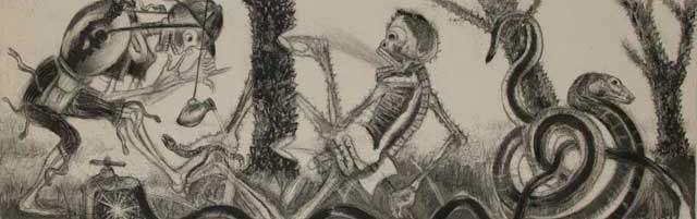 El pintor juchiteco presentará mañana 2 de agosto, en el Centro de las Artes (CaSa) de San Agustín Etla, Oaxaca, una carpeta de grabados dedicada a Posada (1852-1913), que incluye un poema de Francisco Hernández. En ellos se recrean calacas y cabalgaduras del fin del mundo. Criaturas que son mitad humanas y mitad bestias, que acuden a visitar a sus primos hermanos del campo –sapos, vacas, monos y serpientes– para prestarles sus atuendos de huesos, dijo el escritor Jaime Moreno Villarreal a propósito de la muestra
