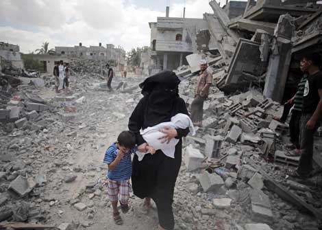 Una palestina y sus hijos deambulan entre ruinas en la ciudad de Rafá, en la franja de Gaza. Militares israelíes subrayaron que la