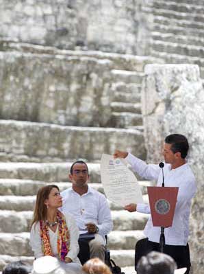 Al pie de la pirámide dos de la antigua ciudad maya de Calakmul, en Campeche, el presidente Enrique Peña Nieto recibe y muestra el certificado de la Unesco que acredita a la zona como