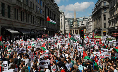 Los ataques en Gaza cobraron ayer la vida de al menos siete palestinos, mientras Alemania, Francia y Gran Bretaña llamaron a un inmediato cese el fuego. En Colombia, el ministro palestino del Exterior informó que su gobierno recurrirá a la Corte Penal Internacional para que indague posibles crímenes de guerra de Israel. En la imagen, protesta en Londres contra los bombardeos en Gaza Foto Reuters