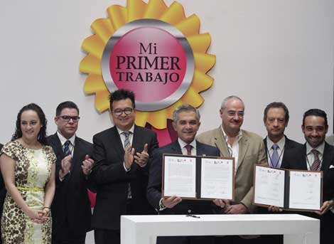 Miguel Ángel Mancera, jefe de Gobierno del Distrito Federal, durante la firma con 10 consorcios del programa para impulsar empleos entre jóvenes de 18 a 29 años de edad, sin experiencia laboral. El político remarcó que el compromiso es tener este año los primeros dos mil elegidos y alcanzar la meta de 10 mil plazas lo antes posible Foto Yazmín Ortega Cortés
