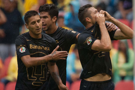 Dante López (derecha), de la escuadra universitaria, celebra su anotación, conseguida dos minutos antes del final del partido ante Las Águilas, que llevaba seis jornadas sin derrota en el actual torneo. Fue el único tanto de un partido en el cual el intercambio de golpes fue continuo. El técnico Memo Vázquez dijo esperar que esta victoria nos dé el ánimo que necesitamos para lo que sigue en el torneo Foto Xinhua