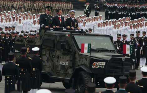 El Presidente, acompañado en la imagen por los secretarios de la Defensa Nacional y de la Marina, general Salvador Cienfuegos Zepeda y almirante Vidal Francisco Soberón Sanz, encabezó el desfile conmemorativo del 204 aniversario del inicio de la gesta de la Independencia y por el centenario de la Defensa Histórica del puerto de Veracruz. Por ese motivo, el comandante de la columna de la parada fue un integrante de la Armada. Un incidente ocurrió en el acto de izamiento de la bandera monumental en el Zócalo, cuando ésta cayó momentáneamente Foto José Antonio López