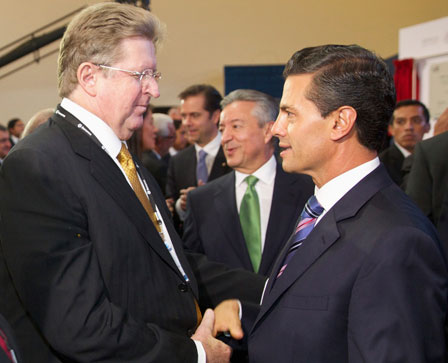 El magnate Germán Larrea, de Grupo México, saluda al presidente Enrique Peña Nieto. Atrás, Manuel Medina Mora y Javier Arrigunaga, directivos de Banamex, el pasado 9 de septiembre en el Distrito Federal, durante un acto en el cual ese grupo financiero anunció un paquete de inversiones Foto Reuters
