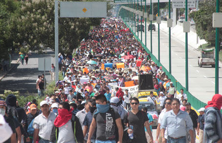 Miles de estudiantes, maestros, campesinos y padres de familia de Guerrero marcharon por las calles de Chilpancingo durante cuatro horas para exigir la presentación con vida de 43 alumnos de la normal rural de Ayotzinapa, así como el castigo a los responsables, materiales e intelectuales, del asesinato de seis personas a manos de policías municipales de Iguala y de pistoleros, en la madrugada del sábado pasado Foto Óscar Alvarado