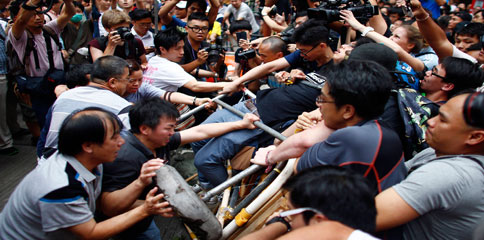 Manifestantes a favor del gobierno de China (izquierda) intentaron remover una barricada instalada por grupos opositores, ayer en Hong Kong. En tanto, los líderes estudiantiles de las protestas abrieron la puerta a dialogar de nuevo con autoridades locales, después que decenas de miles de manifestantes denunciaron los ataques del viernes en su contra Foto Reuters