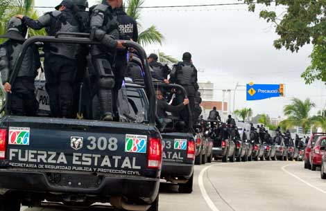Unos 200 vehículos de la policía estatal, incluidos cuerpos antimotines, fueron movilizados al puerto ante la megamarcha que anunciaron para hoy la Coordinadora Estatal de Trabajadores de la Educación de Guerrero y alumnos de la normal de Ayotzinapa, así como de otras organizaciones. Se dijo que hay la intención de ocupar el palacio municipal de Acapulco para demandar que regresen con vida los 43 normalistas desaparecidos Foto Javier Verdín
