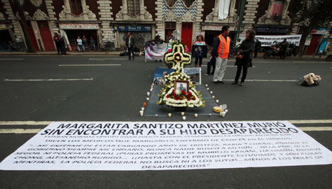 Un féretro con los restos de Margarita Santizo fue colocado ayer sobre la avenida Bucareli, frente a las oficinas de Miguel Ángel Osorio Chong. La señora –quien murió de cáncer de hígado– buscaba desde hace cinco años a su hijo Esteban Morales, policía federal desaparecido en Michoacán. A mi madre la mató la incertidumbre de irse a acostar en la noche sin saber qué le pasó a su hijo, afirmó una hermana del agente. El secretario no fue ayer a su despacho oficial Foto Francisco Olvera
