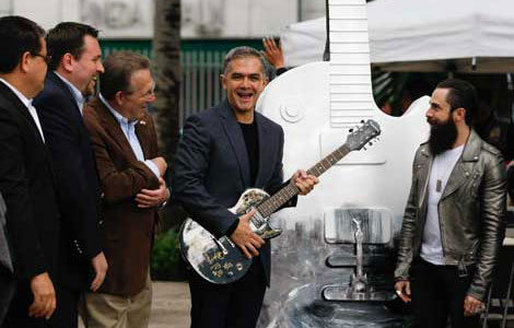 Ayer se inauguró en esa arteria la exposición Guitar Town Ciudad de México 2014, que incluye 80 instrumentos monumentales realizados por artistas plásticos y roqueros. Las piezas, de 3.5 metros de altura, serán subastadas en marzo y lo recaudado se distribuirá en tres fundaciones. El jefe de Gobierno del Distrito Federal, Miguel Ángel Mancera, recorrió la muestra acompañado, entre otras personas, del embajador de Estados Unidos, Anthony Wayne (primero a la izquierda del mandatario) Foto Víctor Camacho