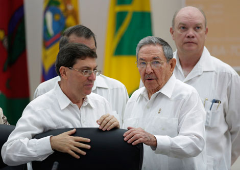 El presidente cubano Raúl Castro, acompañado de sus ministros de Relaciones Exteriores, Bruno Rodríguez, y de Comercio Exterior, Rodrigo Malmierca, durante la ceremonia de apertura en La Habana de la cumbre de la Alianza Bolivariana para los Pueblos de América Tratado de Comercio de los Pueblos, en la que se definieron estrategias conjuntas para enfrentar la epidemia del virus hemorrágico Foto Reuters