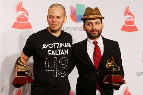 Ayotzinapa somos todos. No podemos permitir que esto siga sucediendo en estos tiempos. ¡Que viva México!, dijo René Pérez Joglar, alias Residente (izquierda), integrante del dueto puertorriqueño de rap Calle 13, durante la 15 edición de los premios en la MGM Gran Arena de Las Vegas, tras obtener dos estatuillas. Lo acompaña su hermanastro Eduardo Cabra, Visitante Foto Reuters